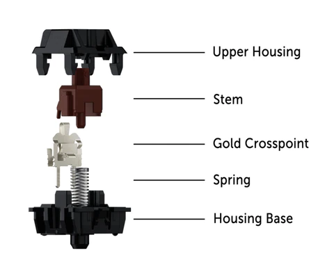 فنر سیم پیچ - مقاومت فنر سیم پیچ میزان فشار مورد نیاز برای به کار انداختن کلید را تعیین می کند و کلید را به ارتفاع اولیه باز می گرداند. این یک جزء مهم است که می تواند بر اساس نوع سوئیچ مورد استفاده شما متفاوت باشد. طول فنرها بسته به نوع سوئیچ شما می تواند متفاوت باشد.